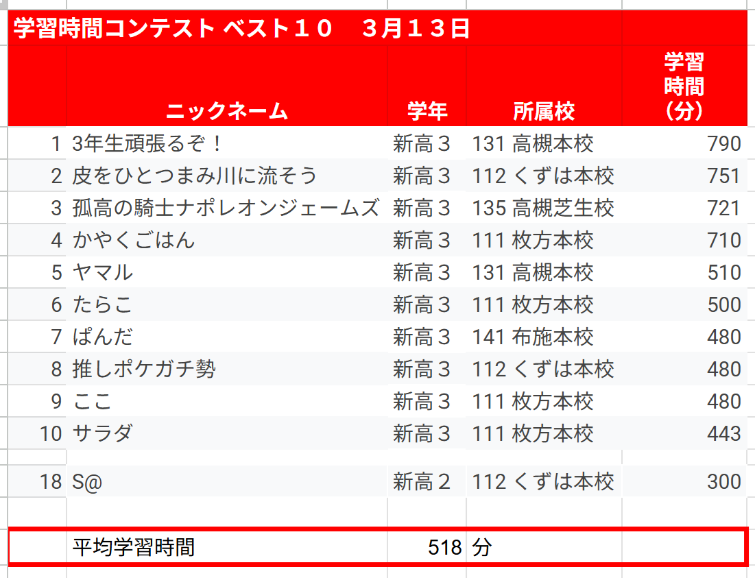 新高3生「高槻本校 3年生頑張るぞ!さん」の790分(13時間10分)、