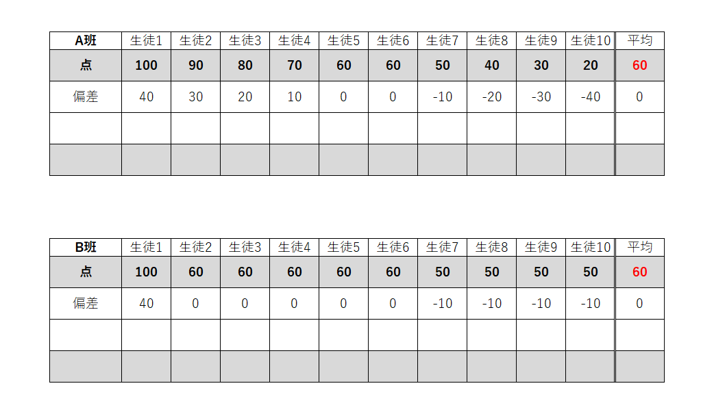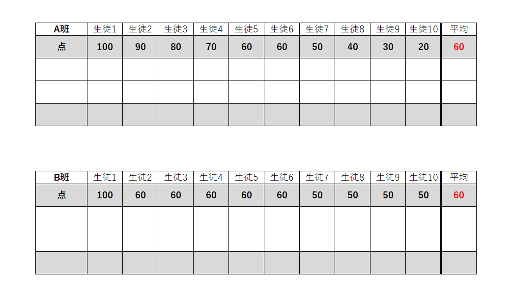 B班の100点の生徒は,他の生徒が60点,50点のなかで1人だけ100点を取っているので,他の生徒に比べ傑出していそう・・・ということを表しています。
