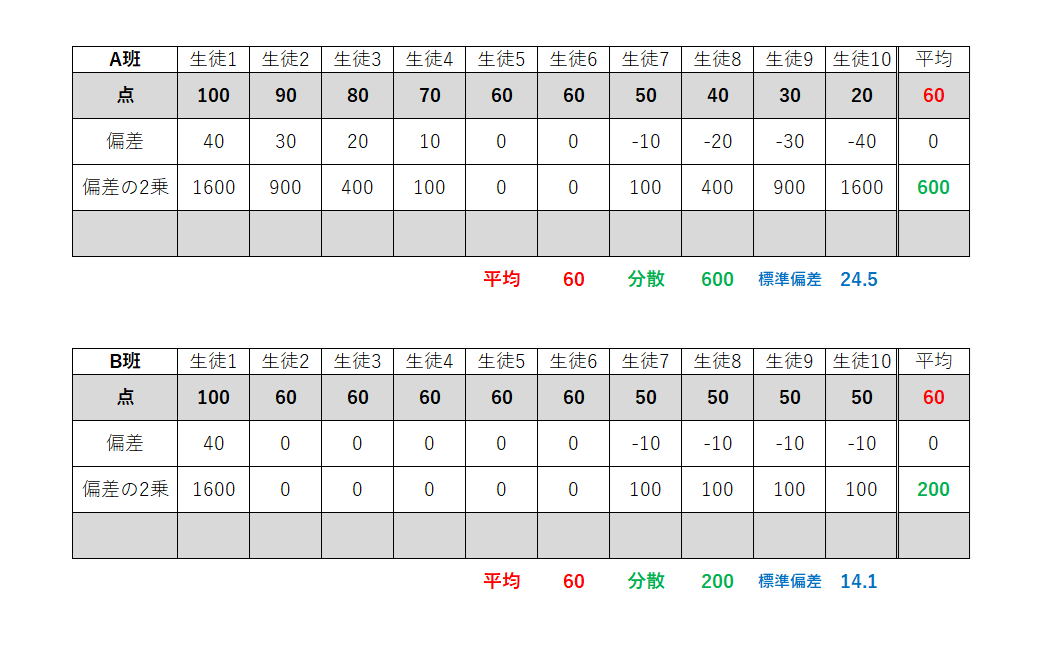 分散を計算すると,平均点からの散らばり具合がわかります。