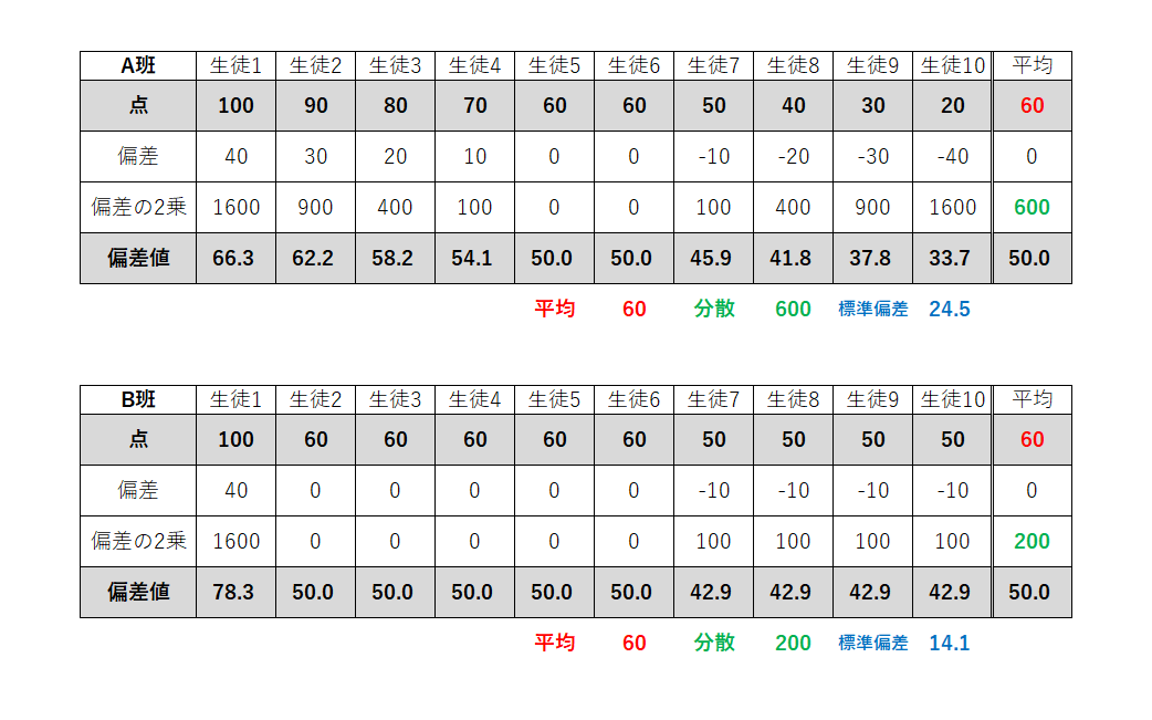 例えば,A班とB班のどちらにも100点の生徒がいますが,A班は66.3,B班は78.3と,B班の生徒の方が偏差値が高くなっています。