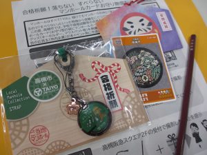 医薬品関連会社とコラボのストラップ,合格鉛筆,マンホールカードです。