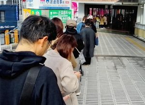 百貨店入口すぐ,配布会場。何人かは市の広報用に写真撮影がありました。