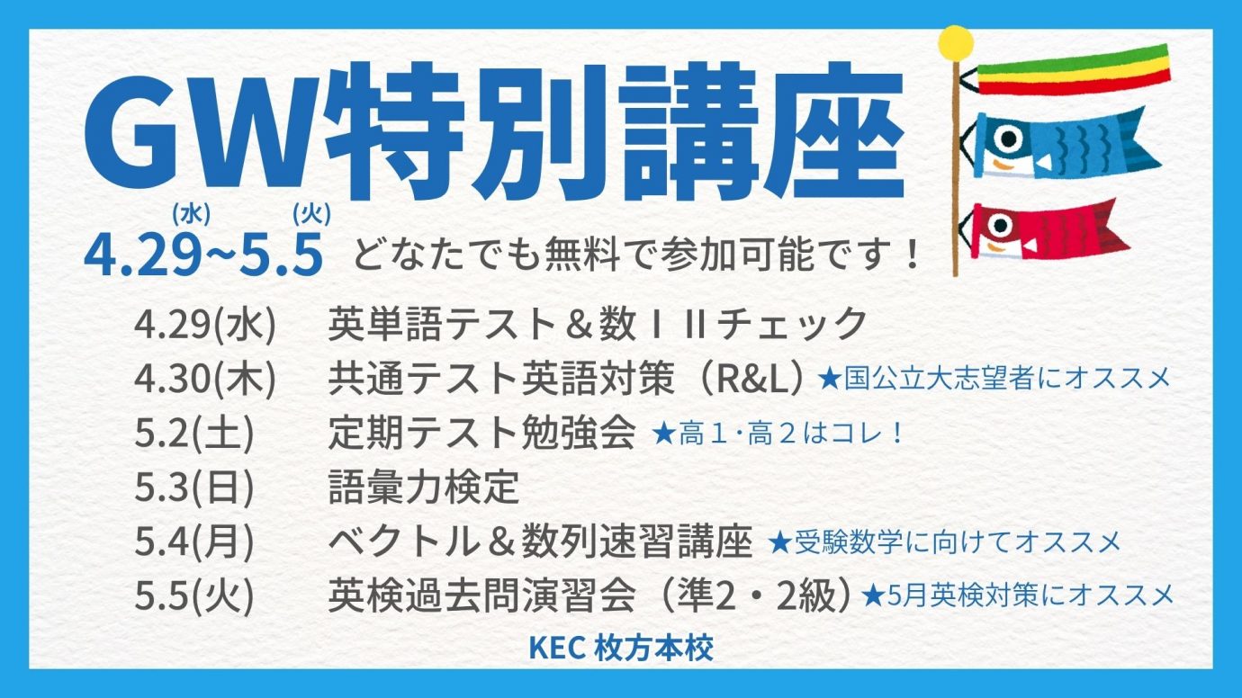 4/29(水)~5/5(火)は通常授業はお休みになりますが、「GW特別講座」(無料) をたくさん開講します!