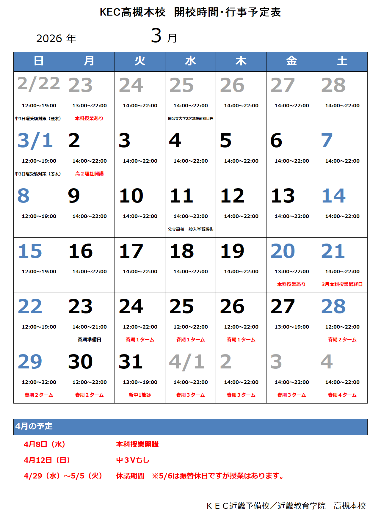 PDF版はこちら→2026-03高槻本校予定表