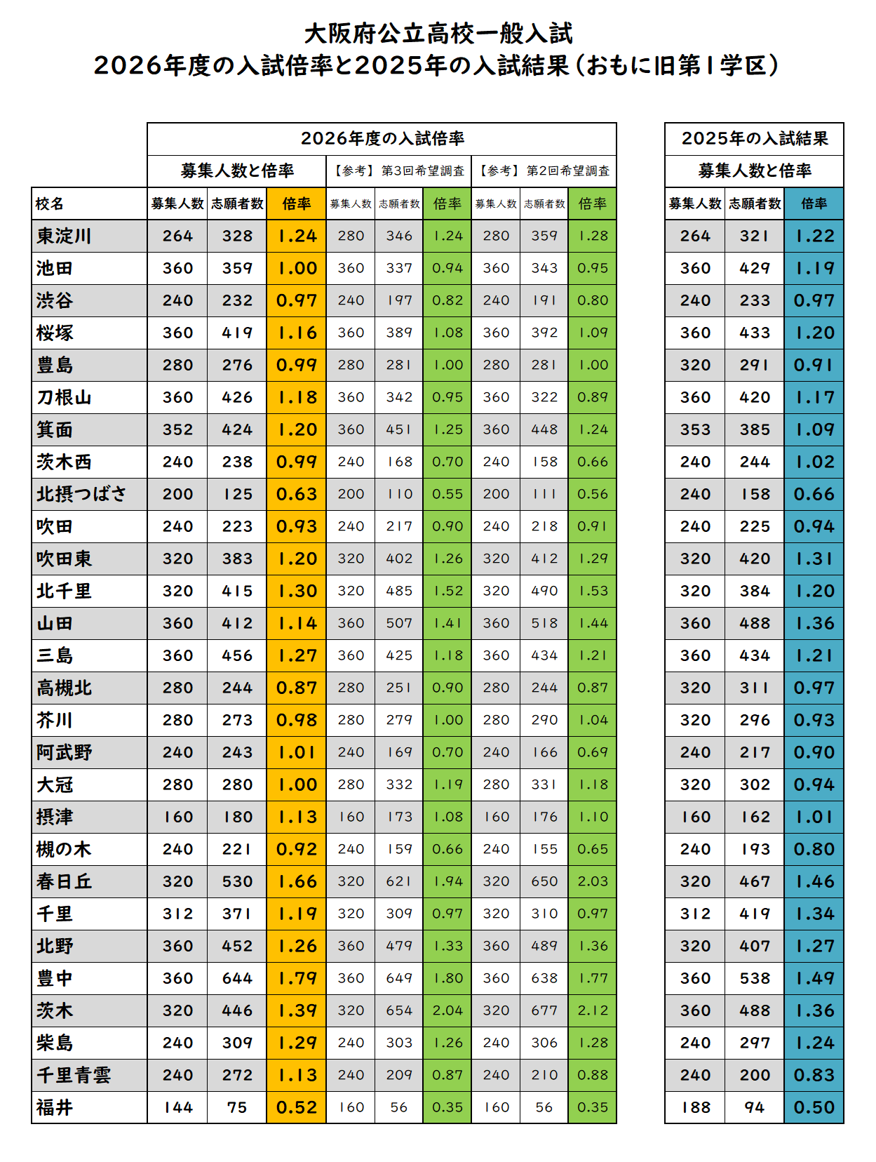 令和8年度大阪府公立高校入学者一般選抜 志願者数と倍率(おもに旧第1学区)