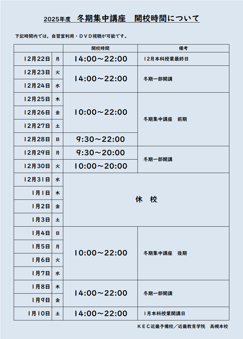 PDF版はこちら⇒ 2025冬期開校時間_高槻本校
