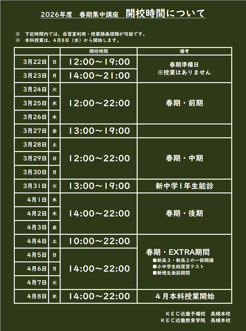 春期集中講座期間(3月24日~4月7日)の開校予定表は、以下の通りです。