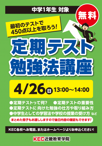そんな,中学,高校の定期テスト対策をしているKEC高槻本校では,初めての定期テストを迎える中学1年生の皆さまを対象に「定期テスト勉強法講座」を実施します。